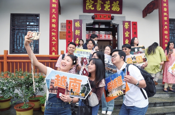 4月23日,留学生在杨花书院打卡拍照。当天是第30个世界读书日,由长沙图书馆主办的“外国友人读长沙”主题活动,邀请来自18个国家的中南大学留学生走进浏阳市大瑶镇杨花书院,通过沉浸式文化体验、乡村建设对话与经典诵读,邂逅中国书院之美。