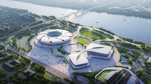 根据建筑概念方案,奥体中心将以活力生态绿芯构建与湘江科学城的跨江轴线,由正反各九片单元网壳交错叠合,与内部的红色体育场心共构体育场基本形态。