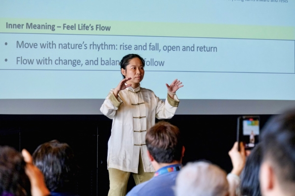 4月27日,在新西兰克赖斯特彻奇,上海中医药大学专家演示八段锦。2025年新西兰南岛“中文+中医”巡讲巡展活动27日在克赖斯特彻奇市中心图书馆举行,当地民众沉浸式体验了多项中医和中国文化活动。