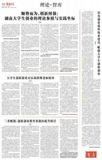 习近平总书记指出,“创新是社会进步的灵魂,创业是推动经济社会发展、改善民生的重要途径”,要“充分激发全社会创业创新创造活力”。2024年12月,《湖南省大力支持大学生创业若干政策措施》发布,提出“七个一”行动,涵盖政策、基金、孵化、导师、创业课程等全链条各方面,为高校创业教育提供了政策支持和实践路径。高校作为人才培养的基地与载体,肩负着培养创新型人才的重任。深化大学生创业教育课程体系建设,赋能大学生创新创业,是高校服务国家创新驱动发展战略、培养新时代复合型人才的重要举措。