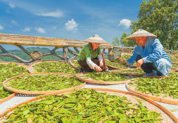 4月28日,保靖县葫芦镇国茶村,村民在晒制柴茶。时下,当地春茶采摘进入尾声,村民抢抓晴好天气赶制柴茶供应市场。