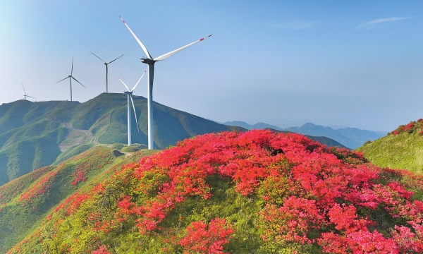 4月28日,常宁市庙前镇与桂阳县莲塘镇交界的泗洲山上,杜鹃与蓝天、白云、风电机组交相辉映,美如画卷。