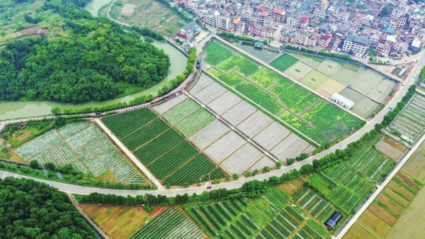 5月7日,新田县中山街道潭田村,菜地、荷塘、民居和路网交相辉映,构成一幅美丽的现代乡村画卷。近年来,该村利用土壤富硒资源优势和城郊地理环境优势,通过整合零散土地,打造高标准农田,发展富硒蔬菜和水果种植,并依托特色种植产业,发展休闲观光农业,促进农业增效、农民增收。