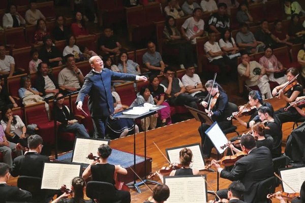 第一乐章中,谭盾特别强调自然元素的呈现,让听众不仅能听到音符,更能感受到空气的流动、万物的呼吸。第二乐章则通过动机的重复强化、乐队整齐划一的运弓,营造出宏大、激昂、充满力量的氛围。第三乐章的柔板被谭盾赋予了湘君、湘夫人的柔情。第四乐章的《欢乐颂》在大提琴低沉序奏后爆发出惊人的能量——合唱团唱响《欢乐颂》,歌声充满了整个音乐厅,整个音乐厅变成一个巨大的共鸣箱。