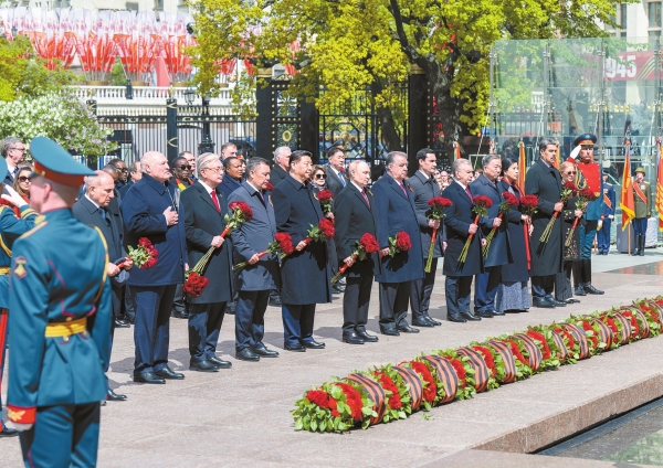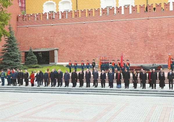 庆典结束后,习近平同其他国家领导人一起从红场来到亚历山大花园,向无名烈士墓献花,并肃立默哀。随后,各国领导人集体合影留念。