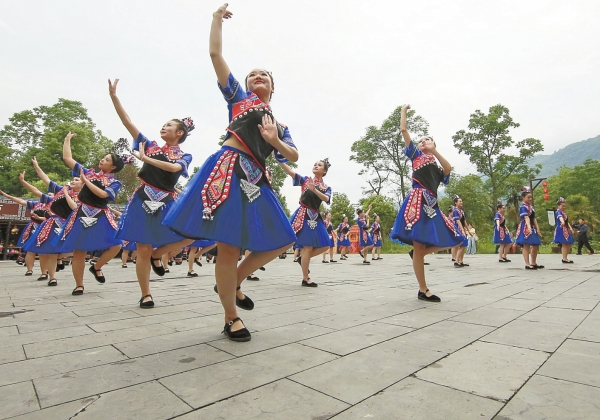 5月17日,龙山县苗儿滩镇惹巴拉景区,演员在表演土家族摆手舞。连日来,“神秘湘西·风韵武陵”武陵山区(湘西)国家级文化生态保护区建设成果展示暨龙山县第十届舍巴日举行。舍巴日是土家族歌舞祭祖、庆丰祈福的传统节庆活动。