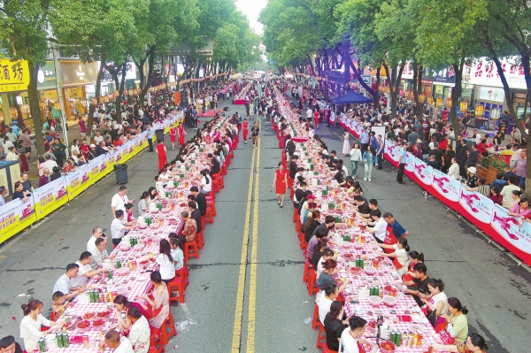 2条168米的长龙宴席,摆满蒜蓉虾、撩水虾、卤虾和麻辣小龙虾。龙虾香味弥漫整条街,食客们大快朵颐。
