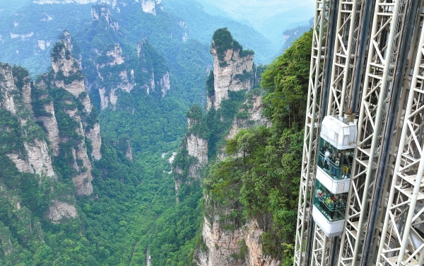 5月18日,游客乘百龙天梯在张家界国家森林公园袁家界景区参观游览。今年,该景区以“锦绣山河,美好旅程”为主题推出森林游、遗产游、亲子游等多元化惠民旅游产品,并开展直播互动、非遗进景区等特色活动,吸引各地游客纷至沓来,感受世界自然遗产张家界地貌的独特魅力。