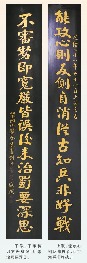 “这种说法成立的可能性比较小。”龚飞解释称:其一,从赵藩过往的态度来看,他对蜀汉特别是诸葛亮素怀崇敬之心,是一个不折不扣的蜀汉“粉丝”。进京赴考时,赵藩还专程前往湖北隆中,拜谒武侯隐居故地并作诗表达仰慕之情;其二,此联创作后即刻制悬挂在武侯祠,如说意含批评,不合常理;再者,该联落款为“权四川盐茶使者剑川赵藩敬撰”,“敬撰”二字足显其谦逊崇拜之意。龚飞表示,就联论联,赵藩写此联的目的只有一个:规劝岑春煊。