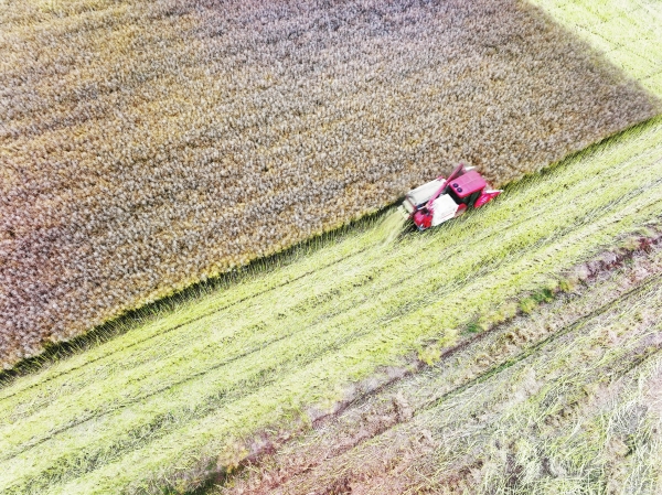 5月18日,澧县澧南镇大堰村,农民驾驶农机在收割油菜。眼下已进入夏收夏种季节,澧南镇组织农机收割油菜、小麦等粮油作物,对收获后的田块及时翻耕,用来种植一季稻。
