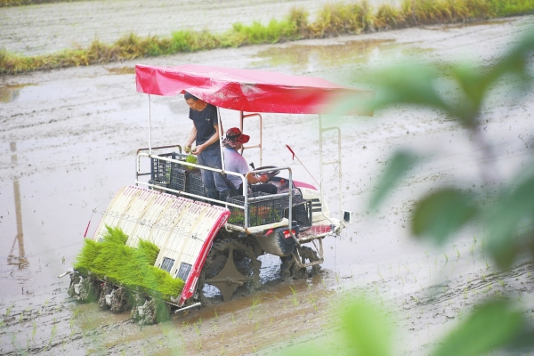 5月18日,通道侗族自治县万佛山镇杏花村,农机手驾驶农机在田间插秧。连日来,当地农民抢抓农时翻耕稻田、栽插水稻,田间地头一派繁忙。
