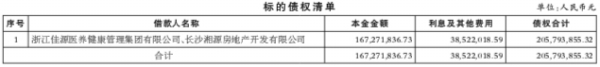 本次拟处置的资产为浙江佳源医养健康管理集团有限公司单户债权资产(以下简称“标的债权”)。截至2025年1月10日(处置基准日),标的债权总额合计20,579.38万元,其中本金余额16,727.18万元,利息及其他费用3,852.20万元。标的债权明细详见下表: