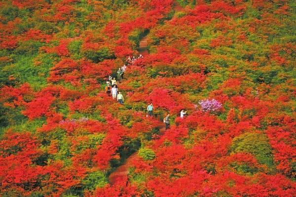 “五一”假期的人潮汹涌,却丝毫不能减损她的仙姿——游人的欢声笑语与杜鹃花的姹紫嫣红交织成奇妙的交响乐,将整座山峦化作一座天然的歌剧院,酷似浏阳烟花节的盛况。