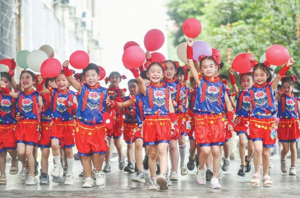 5月27日,参加文艺演出的学生手举气球欢奔。“六一”国际儿童节临近,道县第四小学开展文艺汇演活动,让孩子们在欢声笑语中迎接自己的节日。