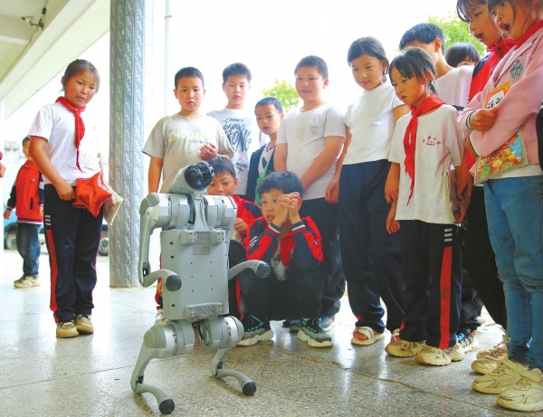 5月27日,隆回县三阁司镇石笋小学,学生在与机器狗互动。当天,该校开展“筑梦童心 科普同行”主题活动,隆回县名师工作室的老师为孩子们带来一场别开生面的科普活动。