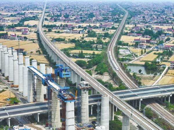图为江苏南通境内的沪渝蓉高铁沪宁段站前Ⅷ标连续梁施工现场(5月27日摄,无人机照片)。新华社 发