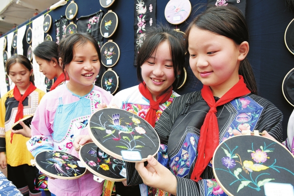 5月29日,学生在观赏展出的苗绣作品。当天,吉首市关工委在寨阳小学举办以“庆端午·迎‘六一’”为主题的苗绣才艺作品展,展示学生们的苗绣作品,让师生及家长共同感受传统文化魅力和苗家少儿积极向上的精神风貌。