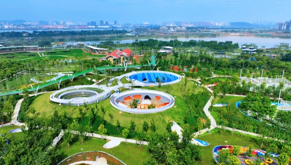与此同时,拥有6.8公里湘江黄金岸线、800亩江心绿岛香炉洲的大泽湖片区贯彻“EOD发展模式”(生态环境导向的开发模式),不断拓展绿色空间。以水为脉,以绿为韵,连通17.5公里黄金河水系,构建1.2公里长100米宽的中央绿轴;巧妙拓宽大泽湖沿江界面,打造长约5公里、宽100米至500米城市阳台;打通麻潭山—湘江—谷山生态廊道,打造北岸总部经济区—湿地公园—滨江广场—游船码头的城市风貌展示轴,充分展现山水洲城特色。整个片区蓝绿空间占比高达45%,“生态绿”成为大泽湖最亮丽的底色。