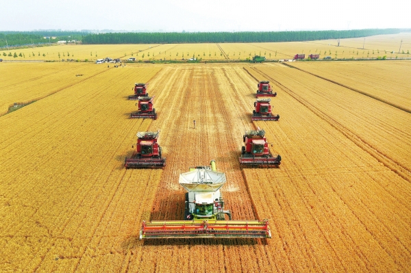 “三夏”时节,各地麦田一片金黄,工作人员紧抓晴好天气抢收小麦,确保颗粒归仓。
