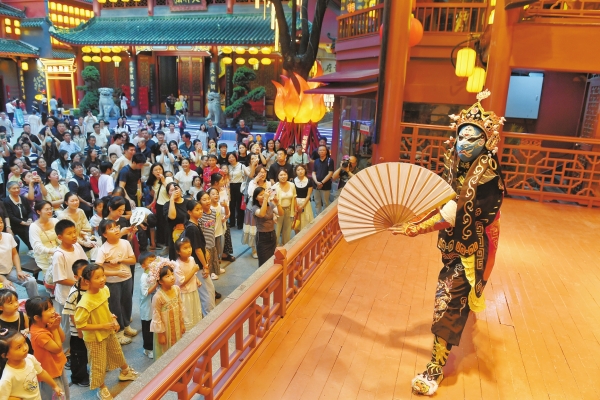 5月31日,长沙坡子街火宫殿举办端午庙会活动。戏台上,古装民乐演奏、变脸表演、汉服走秀等节目精彩纷呈。市集里,手工香囊制作、剪纸、吹糖人等技艺展示,让游客感受到传统手工技艺的魅力。