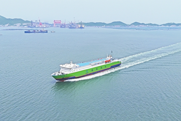 5月31日,新能源汽车运输船“绿安通”轮正式投入烟台—大连航线运营,标志着渤海海峡新能源汽车海上运输专线开通。图为当日“绿安通”轮从锚地驶入烟台港,为正式首航大连做准备(无人机照片)。