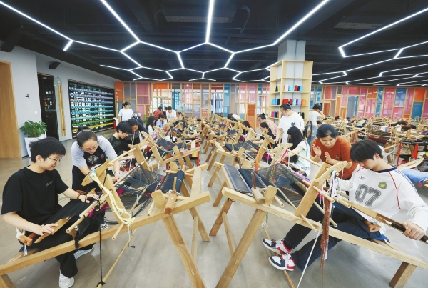 6月9日,大学生在张家界市土家族织锦文化创意园体验土家族织锦技艺。文化和自然遗产日到来之际,当地开设研学“非遗课堂”,将国家级非物质文化遗产代表性项目土家族织锦技艺拓展为研学活动的实践内容,让学生近距离领略非遗魅力。