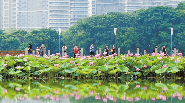 6月10日,长沙市开福区月湖公园,市民在观景赏荷。连日来,公园内的荷花进入盛放期,色彩绚丽,美不胜收。该园的“月湖十景”,就包括醉人的“荷塘月色”。