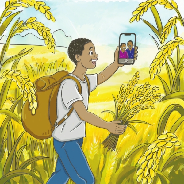 2021年,在长沙隆平稻作公园,高翔钻进两米高的巨型稻下,手捧颗粒饱满的稻穗,与远在刚果(布)的父母视频通话:“看,这就是中国的杂交水稻!”