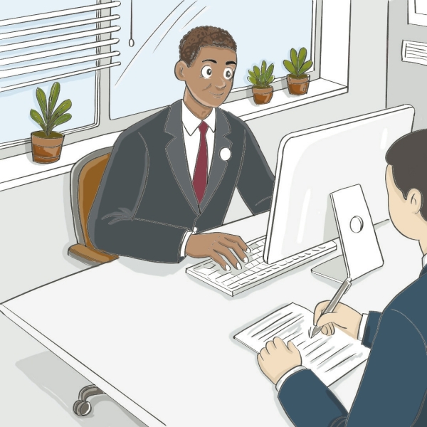 高翔身着笔挺西装,与客户交流。今年4月,高翔进入美兰集团实习,将以“西非人事专员”身份前往科特迪瓦,开启为期一年的派驻。