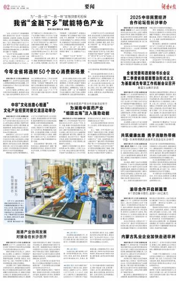 洞庭波涌稻花香。油料、薯类、茶叶、柑橘、香菇等经济作物矩阵,宁乡花猪、江永香柚、炎陵黄桃、龙山百合、靖州杨梅等一大批县域特产,构架起从“洞庭粮仓”到“全球餐桌”的农产品供应链。今年,湖南省委一号文件明确着力发展县域富民产业,持续优化种养结构、实施绿色农产品及食品加工业倍增计划、分类推进县域经济高质量发展。