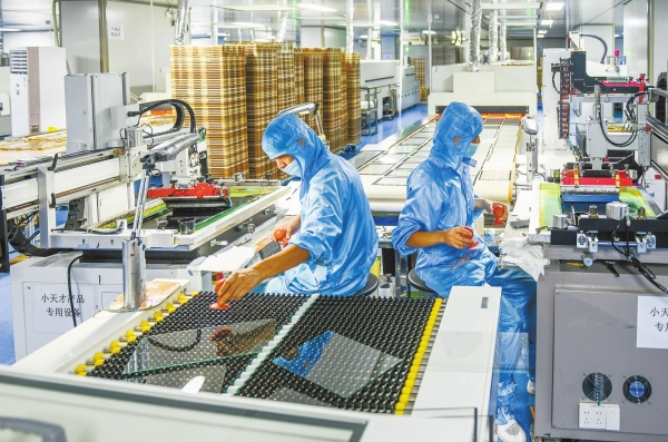 6月12日,道县高新区湖南沃玻科技有限公司,工人在触摸屏玻璃盖板生产线上作业。近年来,该县以绿色转型为底色、科技创新为引擎,升级传统产业,引进培育新兴产业,不断提升园区企业高端化、智能化、绿色化水平,助推经济高质量发展。