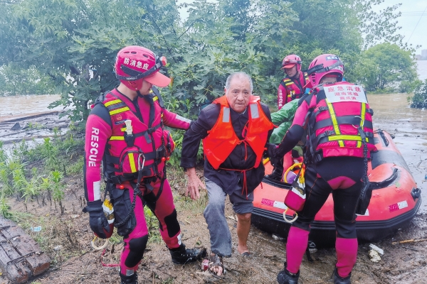 6月21日,津市市襄阳街街道古大同社区老果园地段,4名老人被洪水所困。津市消防接警后迅速出动,成功将被困老人转移至安全地带。
