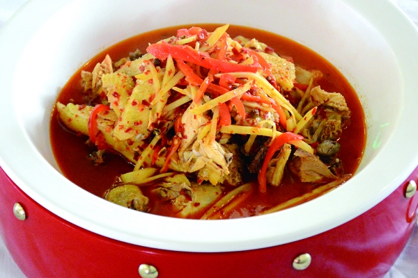 烹饪技艺尤为考究:整鸡焯至八成熟,切为“八大八小”十六块,暗合旧时八仙桌宴客之礼。鸡头(凤头)、鸡尾(凤尾)敬献长辈贵宾,鸡腿赠孩童,体现尊老爱幼的传统。随后以花椒、辣椒、姜丝煸炒,辅米醋提香,倒入原汤焖煮,成菜酸辣鲜麻,嫩脆交融,六味浑然天成。