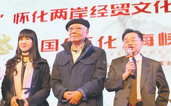 随后,主持人邀请郑愁予、绿蒂、王婷一行3人登台接受赠花并分享感言。耄耋之年的郑愁予手握话筒激动得说不出话来。绿蒂见状,接过话筒说,我们回到大陆,来到湖南怀化参加诗会,郑愁予和我一样,希望看到一个统一、团结、富强的中国,而诗歌是联系海峡两岸的纽带和桥梁。