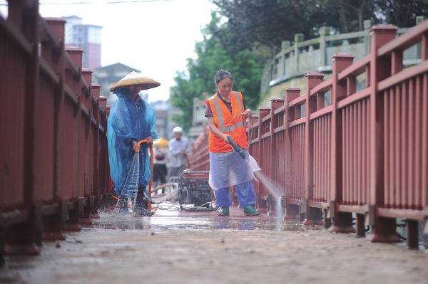 6月23日,通道侗族自治县双江河沿河步道,工人在清理淤泥。连日暴雨导致该县双江河沿河步道受淹,大量淤泥、杂物堆积。洪水退去后,当地立即组织人员开展清淤和设施检修作业,全力保障居民正常生活秩序。