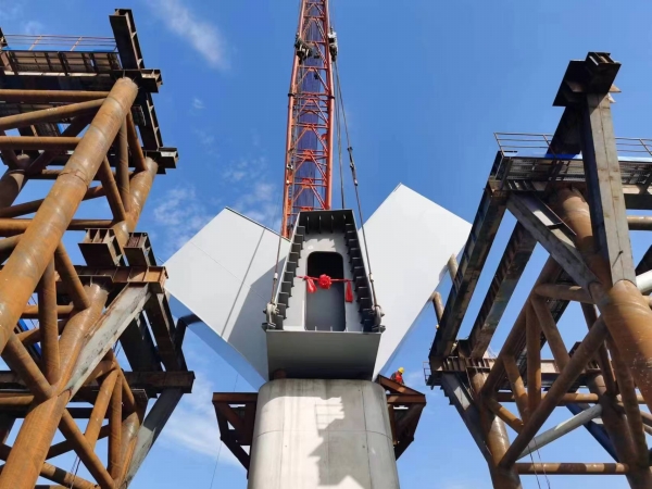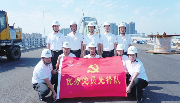 为解决大型支座安装的难题,党员先锋队曾经接续奋战3个昼夜,关键节点反复数据模拟,现场试验6次,成功完成首个大型支座安装。超长钢管桩入岩、超重钢箱梁吊装……面对复杂的地质条件、高难度的技术要求等施工“瓶颈”,党员先锋队现场研究建设过程中的重点、难点、堵点,全面按下项目“快进键”。