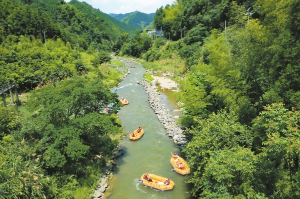 6月26日,常宁市塔山瑶族乡西江漂流正式开漂,游客在青山绿水间享受亲水活动带来的清凉和乐趣。