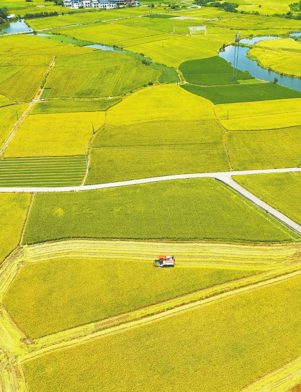 7月3日,衡山县白果镇,村民驾驶收割机在收割早稻。仲夏时节,该县种植的早稻次第成熟进入收割季,当地村民抢抓晴好天气收割早稻,确保颗粒归仓。