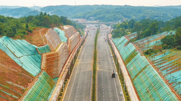 7月6日,长株潭融城干道科创大道项目工地,工人在进行护栏、交通标识安装等扫尾施工。目前该项目关键标段(白庭路至潇湘大道段)已完工。