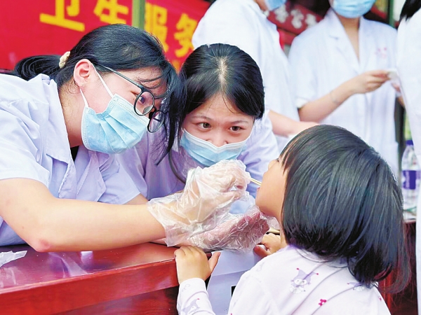 7月8日,大学生为小朋友检查牙齿。当天,长沙医学院“长小团”暑期“三下乡”实践团队来到汝城县文明瑶族乡文市村开展义诊活动,为村民提供健康服务。