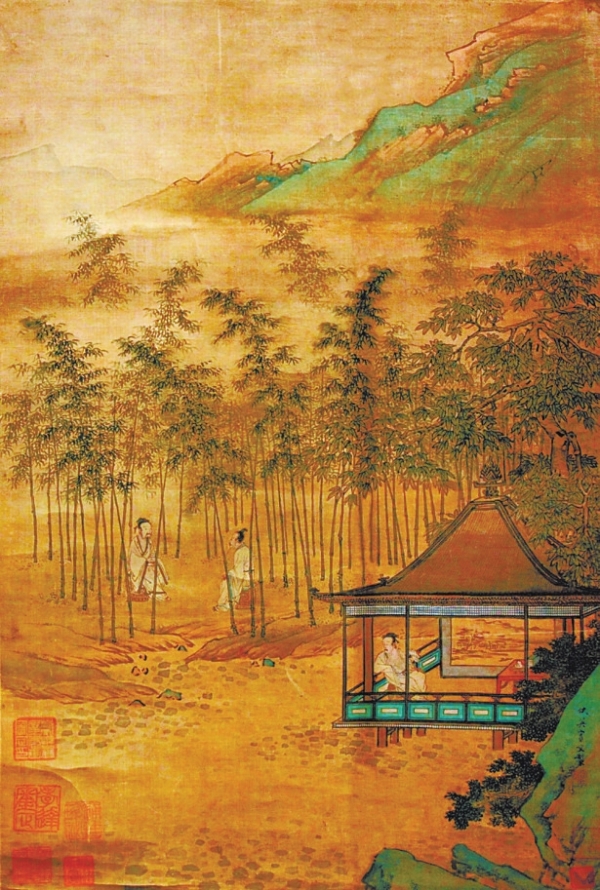 画中,梧桐与翠竹是绝对的主角,相映成趣。梧桐枝叶如盖,荫蔽一座探入溪流的水阁;阁中一人斜倚栏杆,轻摇羽扇,观竹听风,忘却尘世。疏竹之间,两位高士,对坐清谈,宽袍长髯,神态悠然。整幅画作,没有刻意描画的烈日,没有挥汗的焦灼,连风穿叶隙的沙沙声,都似被墨色滤过,轻缓柔和,颇有“竹深留客处,荷净纳凉时”的意境。