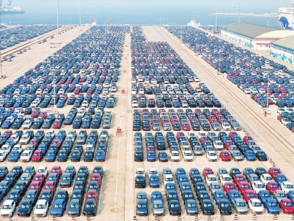 7月10日,中国汽车工业协会发布的数据显示,2025年上半年我国汽车产销量首次双超1500万辆,均同比实现两位数增长,汽车产业活力持续释放。图为7月10日,出口汽车在山东港口烟台港集结等待装船(无人机照片)。