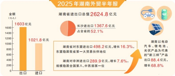 7月22日,长沙海关举行2025年上半年湖南省进出口情况新闻发布会。今年上半年,湖南省进出口总值2624.8亿元,其中出口1603亿元,进口1021.8亿元;长沙进出口1367.6亿元,占全省的52.1%。6月份单月,全省进出口511.8亿元,同比(下同)增长14.5%,高于同期全国增幅9.3个百分点,其中出口318.6亿元、增长14.3%,进口193.2亿元、增长14.9%。