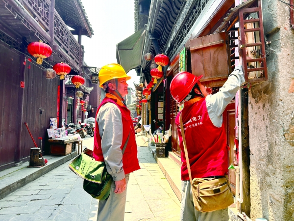 国网湘西供电公司员工在泸溪县浦市古镇开展安全巡视,为用户检修用电设备。 |