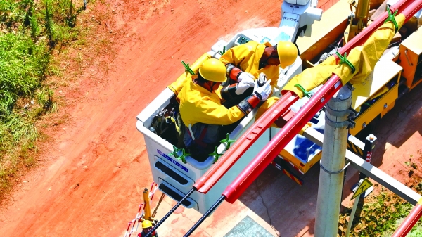 7月9日,国网长沙供电公司工作人员在10千伏中石线开展带电作业,挥汗如雨。巫宇龙 摄 |
