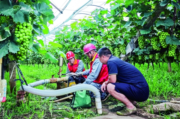 6月27日,在常德市安乡县大湖口镇大罗村,国网湖南电力东方红(电骡子)共产党员服务队队员赵海兵、孔俊晖深入葡萄种植基地,为种植大户宋祥辉提供“安心”延伸供电服务。针对汛期排涝需求,服务队重点检查种植基地漏电保护器、排水电机等设备。 |