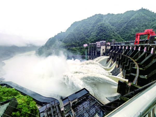 国网湖南水电公司科学调度,所辖柘溪、凤滩两大水库高水位运行,加上东江水库蓄水,储能值达13亿千瓦时,确保22台发电机组随时开得出、顶得上。 图为6月20日,凤滩水库泄洪。王铭安 摄 |