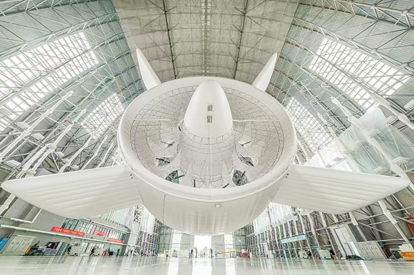 浮空发电系统外形酷似飞艇,是岳阳经开区新引进的浮空器总装试验厂房生产的第一台套最新型高空风能发电装备“SAWES1500”。工作时,这个超大型“飞艇”翩翩上升,到达高空后利用高空风力发电,成为“空中发电站”。