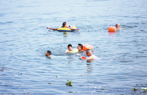 7月30日傍晚,湘江长沙市开福区段,一些小朋友在家长的陪同下到江中游泳或戏水。当前正值主汛期,部分区域水情复杂,暗流涌动。尽管沿岸设置了警示标识,但每天仍有不少市民涉险下水。希望广大市民提高安全意识、远离湘江野泳,警惕溺水风险。