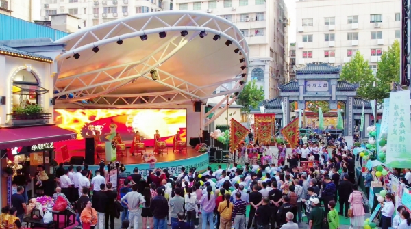 每周六晚上,在中山南路与先锋路交会处,华南集团二楼的小阳台上,一把吉他、一个麦克风,搭建起简易的街头舞台,怀旧金曲接连唱响,吸引市民游客驻足观赏。